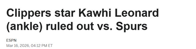 北京时间3月17日,洛杉矶快船球星科怀-莱昂纳德因左脚踝扭伤,将缺席今日对阵旧主马刺的比赛。