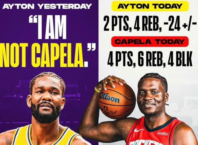 更让人无法接受的是,就在这场耻辱性失利之前,湖人输给魔术,狂砍21分14篮板的艾顿在接受媒体采访时大放厥词:“他们想把我变成克林特·卡佩拉,我可不是卡佩拉!” 那语气里的不屑与骄傲,仿佛卡佩拉是什么拿不出手的角色,仿佛他这个状元,就该高人一等,就该不做那些“脏活累活”。可艾顿啊,你倒是看看,你嘲讽的卡佩拉,如今在火箭做着什么;再看看你自己,在湖人又干了些什么。