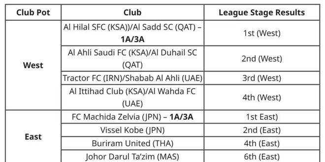 球队将按地区分为东西两组,组内排名最高的球队将根据联赛阶段成绩确定。在西区球队尚未确定的情况下,将设立占位符,并按对应对阵中排名更高的球队联赛阶段成绩进行排序;在东区,日本的町田泽维亚为东区头号种子: