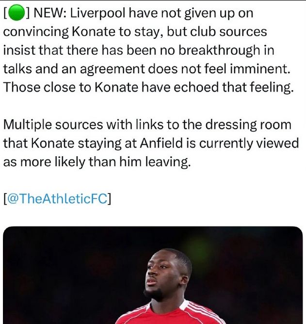 TA:利物浦并没有放弃说服科纳特留下来,但俱乐部消息人士坚持认为,谈判没有取得突破,协议也不是只剩签字,科纳特关系密切的人也同样是这种感觉。