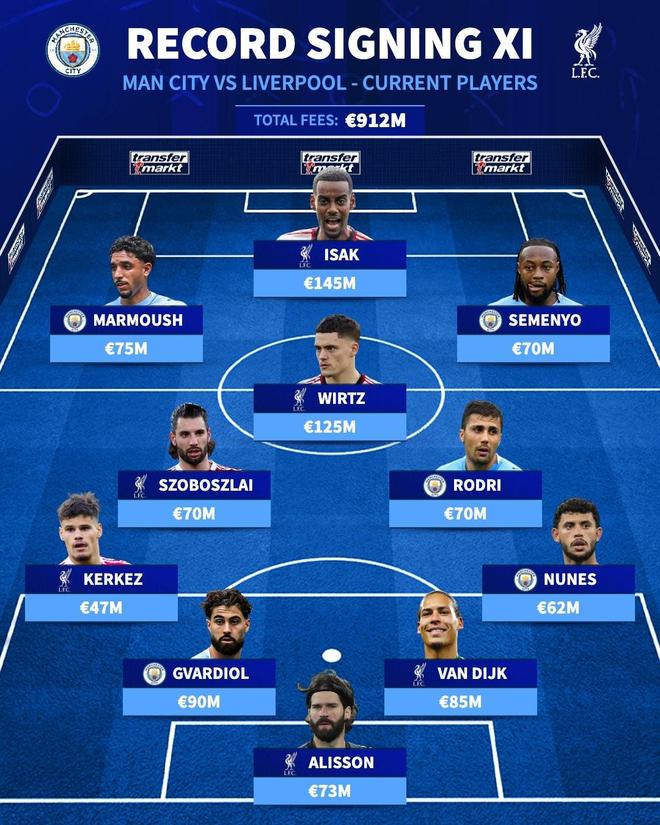 北京时间明天19:45,曼城和利物浦将在足总杯1/4决赛交手。德国转会市场网站列出了两队现役最贵转会费的阵容,其中利物浦六人、曼城五人基本平分秋色,利物浦在去年夏窗重金签下的伊萨克、维尔茨位列前二,这套阵容的总转会费则达到了惊人的9.12亿欧元。