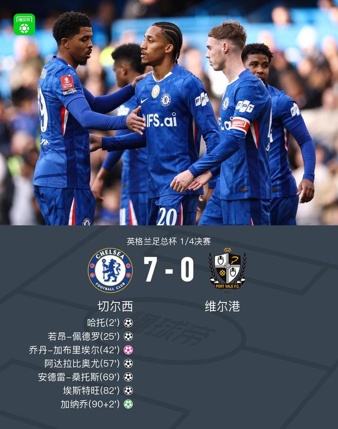 北京时间4月5日00:15,足总杯1/4决赛,切尔西主场迎战英甲球队维尔港。上半场,哈托禁区内抽射破门,内托助攻若昂-佩德罗扩大比分,半场结束前,帕尔默门前补射造成乔丹-加布里埃尔自摆乌龙。下半场,埃斯特旺低射击中立柱,内托内切抽射被扑,随后托辛、安德雷-桑托斯先后头球建功,埃斯特旺门前补射锦上添花,补时阶段加纳乔点射破门,最终,切尔西7-0战胜维尔港晋级足总杯4强。