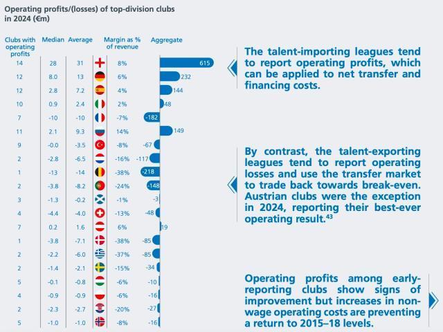 报告指出,人才引进型联赛往往盈利,这些利润可用于支付净转会费和融资成本。相比之下,人才输出型联赛往往运营亏损,并利用球员买卖以期实现收支平衡。