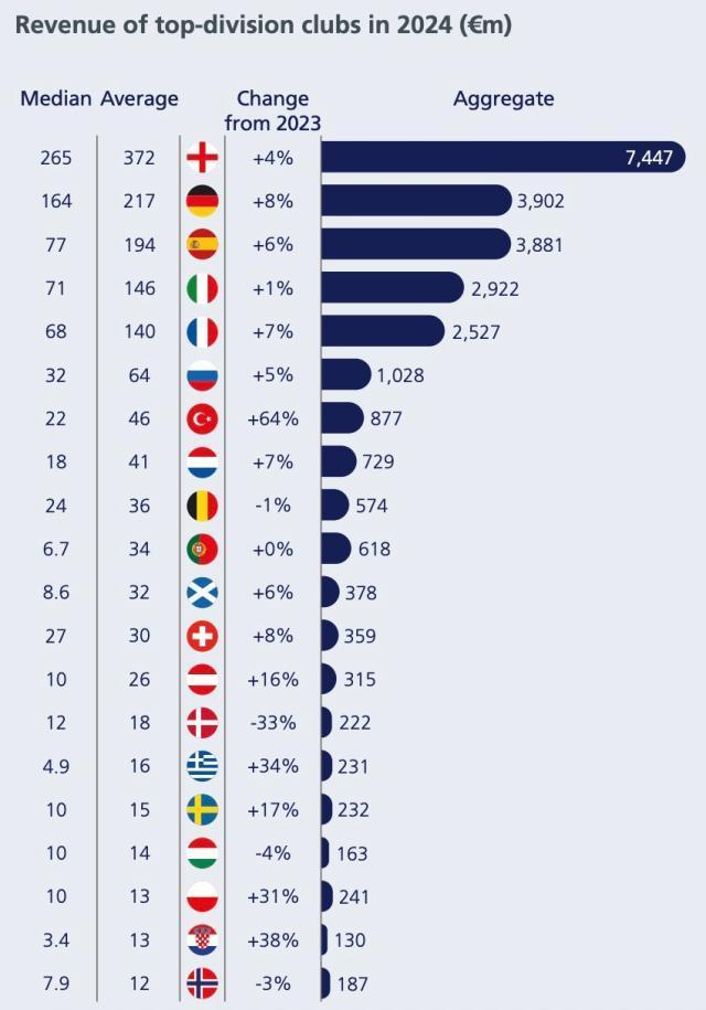 收入排名前20的联赛中,有16个联赛在2024年实现了收入增长。英格兰俱乐部继续创造最多的收入,尽管其收入占比从27%下降到26%。德国俱乐部的收入中位数是西班牙、意大利或法国俱乐部的两倍多。