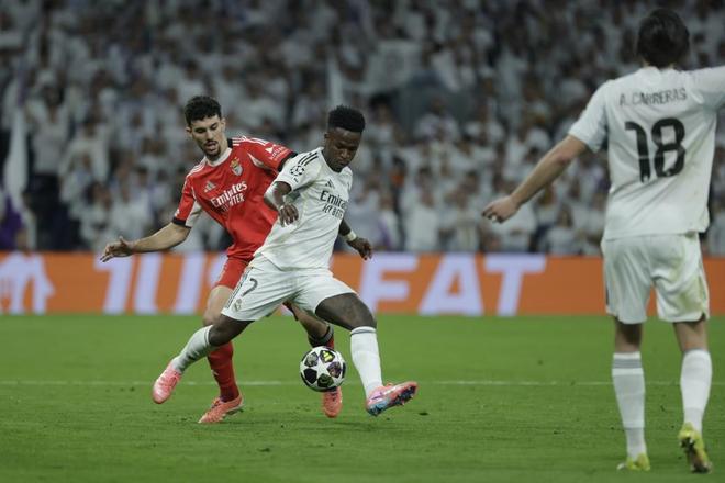 2月25日,皇家马德里队球员维尼修斯与本菲卡队球员里奥斯(左)拼抢。新华社