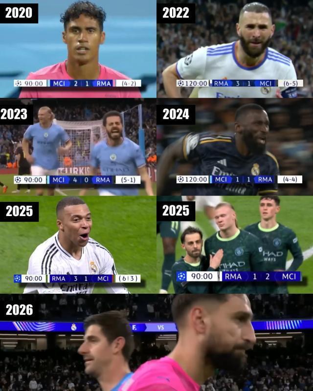 欧冠16强抽签出炉,曼城和皇马再次分在一起,这是两队连续第5个赛季在欧冠淘汰赛相遇,刷新了历史纪录,从2020年1/8决赛开始到本赛季,双方交战13次,其中本赛季已在联赛阶段有过1次交锋,曼城客场2比1获胜。