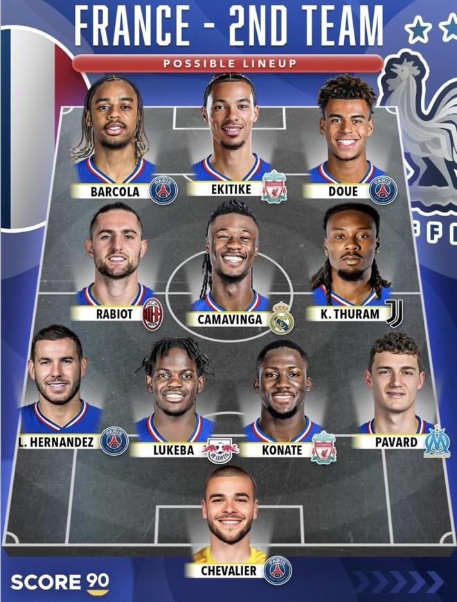 这两套“法国一队+二队”摆在一起,直观感受就是厚度太夸张:一队的前场和中场都是欧洲顶级俱乐部的主力配置,换到国家队层面,能把速度、对抗和终结同时拉满;而二队并不是“凑数阵容”,很多位置换一批人,依旧能把攻防体系完整跑起来,强度和上限都在线。